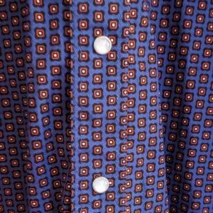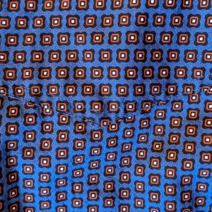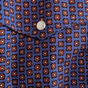 You'll be dressed for every occasion in this fantastic western-cut men's long-sleeve Roper Amarillo Collection Copper Creek Foulard shirt! 100% cotton in a foulard pattern of small tomato red squares on rich blue with a little black and white tossed in to make it pop. Gleaming pearl snaps. Spread collar. (One button at collar.) Curved front yokes, 1 point each, curved back yoke, 1 point. Two chest-flap pockets with snaps. Standard Large-Tall size. An great-looking shirt in absolutely perfect condition!