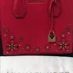 Like New Michael Kors Pink Leather Handbag. Comes with shoulder strap and rolled leather handles. Approximately 8.5”L x 8”T x 4” D. 3 card slot on interior wall and zippered interior divider pocket. Comes with dust bag. I bought this for my daughter at Macy’s, she carried it one time and never used it again. Please see my other listings and bundle to save.