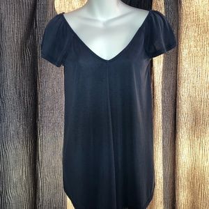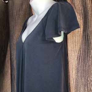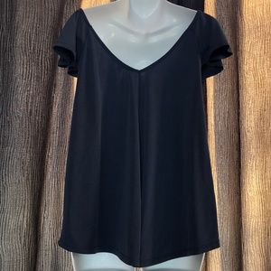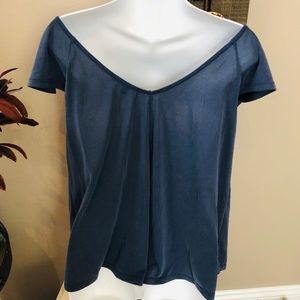 Like New Green Envelope Women's Wide Shoulder front and back V neck Flutter Sleeve Blouse. Size Small. Could be worn slightly off the shoulder. Steel blue colored, very soft & smooth feel. Feminine and flirty look. 65% modal, 35% polyester. Excellent used condition. Worn once. No signs of wear.
