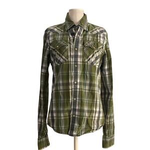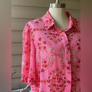 I am in love with this top! The color and print is beautiful. Shirt looks new. Lightweight, cute open over a tank or tucked into the front of a pair of shorts or jeans. Reminds me of vacation/summertime!