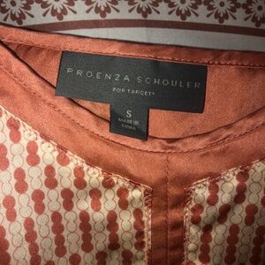 Beautiful salmon pink blazer and cami set from Proenza Schouler for Target blazer has one button in front to close and patches on elbows add a classy touch and cami is a salmon pink as well with touches of ivory in bust area. Cami has a side zip and the straps are adjustable and cami is 100 percent SILK as well again a great touch items are smoke free no tears Great condition