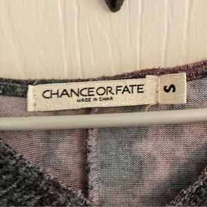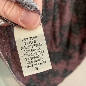 The sleeves of this long-sleeved purple and gray tie-dye tunic sweater are fitted but the body is very loose and flowy. Only worn a couple of times…has a lot of life left! It’s a soft fabric, very cozy!