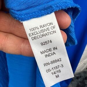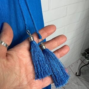Excellent, perfect, condition. Such a pretty blue color (my favorite :)! Comfy, ties on the front with tassels at the ends. Size 14/16. The chest measures approximately 21 across laid flat, easily stretching to 23 across. You can see it fits easily even loosely while: Photographed on a mannequin Size 14-16: shoulder to shoulder width 15.2"; bust 41.8"; waist 35.6"; hips 44.5"