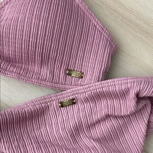 Stylish and comfortable pink ribbed bikini set perfect for beach days. Enjoy a flattering fit with this chic swimwear.