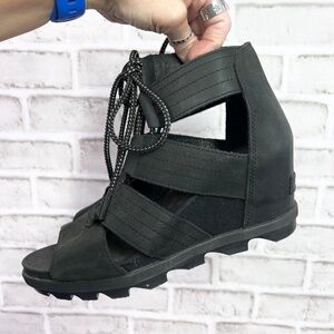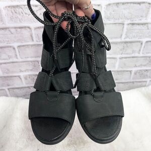 Excellent, even perfect, condition. Black leather lace up sandals with a wedge heel. Size 9.