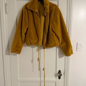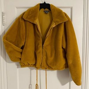 Like New! Sans Souci Golden Yellow Faux Fur Bomber Jacket with Drawstring Waist