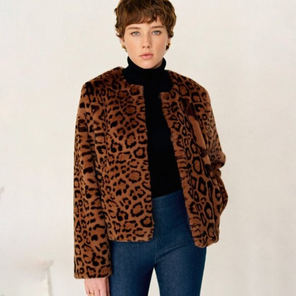 Sézane Cleo jacket featuring a collarless design, hook-and-eye closures, welt pockets, a fully-lined interior, and a soft faux fur exterior in a classic brown and black leopard print.