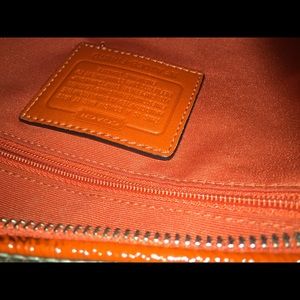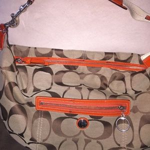 Medium sized on the shoulder Coach bag with Orange and tan monogrammed.Excellent condition medium Coach purse , only carried several times.Measurements 10.5" wide , 6.5 tall, and 2.5" deep with adjustable strap