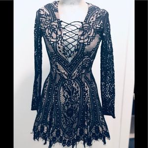 Like new tried on never worn. I have the small fit me better and love it. I’m 5”8 so the xs this piece was too short on me. Super sexy and amazing for these upcoming holiday events. Exposed zipper back. See through long sleeves navy lace. Bottom is flare and sculpted with three layers. Black sturdy bottom layer to mold shape. Than nude layer which also lines bodice with navy lace overlay. Deep v neckline with adjustable ties to make as sexy or more modest depending on your preference. Amazing