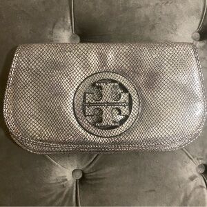 Like New TORY BURCH Chrome/Silver Metallic With Gunmetal Chain Linked Crossbody/Clutch
