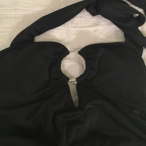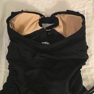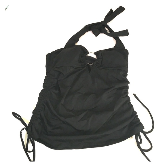 Wore this top once or twice!! This top is comparable to Billabong or Roxy, I bought it at a local Sweetwater Surf Shop. This Tankini top has a dramatic plunge neckline, held together by a silver hoop. Rouched sides are adjustable. Very comfortable (and superrr flattering!) top