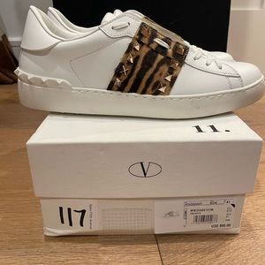 The Untitled sneakers from Valentino Garavani don't need any introduction. Designed in a white panelled construction with a tiger-print detail down the side, this low-top pair is finished with Rockstud embellishments in a gold-tone and a tonal white.