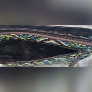 Stylish wristlet with a vibrant geometric pattern. Features a mix of blue, green, and black colors. Perfect for on-the-go use.