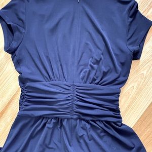 Navy wide leg jumper. Cute gathering at waistline. Zipper in back. Polyester/spandex