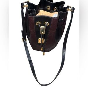 Authentic Handcrafted Leather Goods HCL buttery chocolate brown leather drawstring bucket bag with black leather details and genuine brass hardware. Has an adjustable black crossbody strap and is made from amazing quality leather! Leather lining has a zip pocket inside and logo print. Drawstring cinch at the top and engraved brass nameplate.