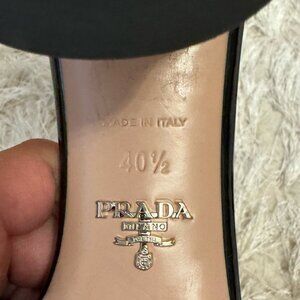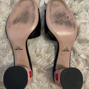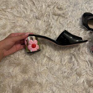 Like New: Vintage Prada Mules Pink Flower Black Patent Leather Sandal Heels