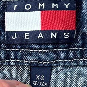 These vintage Y2K jean overall shorts feature embroidered Tommy Hilfiger logo adjustable straps with silver hardware. There is one large front snap pocket on the bib, 2 front side pockets, 2 back pockets, a small double pocket on the bottom right leg, & of course a Tommy Hilfiger logo loop. 100% cotton. Made in the Philippines.