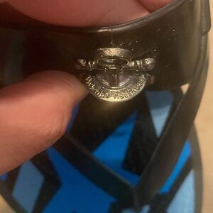 Upgrade your summer wardrobe with these Like New Vivienne Westwood Women's Rubber Flip Flop Slides. These stylish slides feature a striking black and blue geometric design on the footbed, perfectly complemented by the iconic Vivienne Westwood orb logo on the strap. Made from durable rubber, these flip flops are designed for comfort and longevity, making them ideal for beach days, poolside lounging, or casual outings. Their unique design ensures you'll stand out in any setting, while the high-quality materials provide a comfortable fit. Add a touch of luxury to your summer essentials with these chic Vivienne Westwood flip flops!