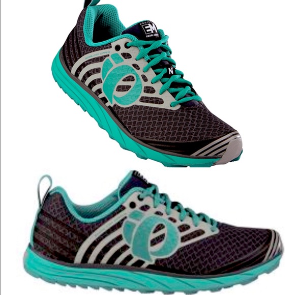 This is a pair of Like New Women’s Pearl Izumi EM N1 Trail Running Shoes in Teal and Gray Size 9