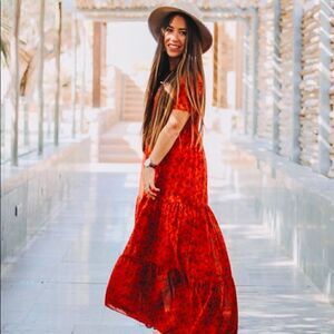 Indulge in the perfect blend of elegance and bohemian flair with the Like New Zara Petite Black Floral Print Smocked Maxi Red Dress. Missing button closure. This stunning piece seamlessly fuses contemporary style with a touch of romance, making it a must-have addition to your fashion repertoire.