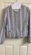 This like new tweed blazer by Adrienne Vittadini is classy and preppy. Features two shallow front pockets, full front zip, fully lined, fringe at cuffs and hem and is short. Fun ivory and blue stripe and geometrical pattern, so vintage! This would be great with white pencil skirt, white pants or even to dress up jeans.