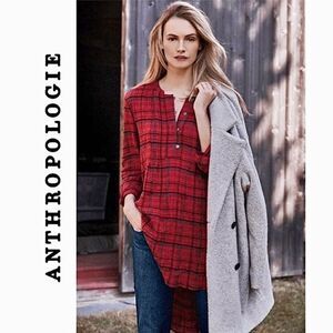 This oversized tunic by Holding Horses for Anthropologie features a Henley neckline with 4 button placket, long sleeves with button cuffs (sleeves also have button tabs giving the option to wear them rolled up), pleat detailing at the back and a curved, dramatic high-low hemline with split sides. Fabric is lightweight and softly textured. Color is “Red Motif”, a beautiful red with black and dark gray plaid design.