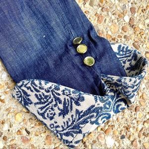 Arden B Y2K 90s retro lined cream and denim jacket blazer with a gold button and cuffed brocade sleeves and front flap pockets