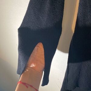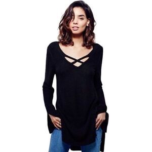Like New Free People Black Criss Cross Tunic Boho Knit Sweater. Crisscross detail at v-neck, loose-fitting, high low hem with slits at sides and cuffs. No piling.