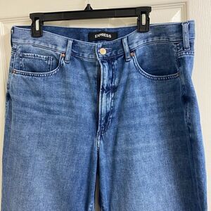 Like New Womens Express Hugh Waisted Wide Leg Cropped Jeans. Dark distressed Wash. One button and zip fly closure. 5 pocket style.