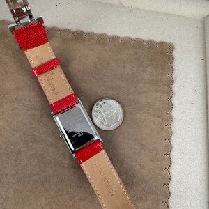 Like Red Red Wine this fine Vintage Lucien Piccard Ladies Rhodium Plated Lab Created Rubys, Mother of Pearl Dial with silver tone numerals, Silver hands and a genuine 9 inch Red Embossed leather Strap with Deployment Buckel - Movement type is Swiss Quartz - Closure: Deployment Buckle - Adjustable - Red Genuine Fine Leather Band Style New