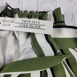 Like an Angel Boyfriend Striped pant with belt,high rise waist, polyester/spandex blend, button/zip closure, 26" inseam, stretch elastic waist, side slit on leg hem,faux back pocket, NWT, never worn/used, small spot on left leg, see pic 13