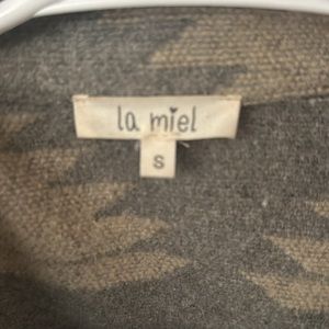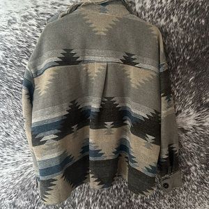 Blue Aztec jacket two button pockets on front and distressed look with some fringe threads, I’ve only worn it like maybe four times to dress up a little size small but would fit medium just fine!
