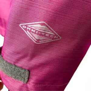 Columbia Omni-Tech 3-in-1 Snow Ski Jacket with pink waterproof hooded shell and zip-in black quilted liner. Liner can be worn separately as well. Adjustable velcro cuffs and interior toggle drawstring in shell. Vented with multiple zipper pockets in both shell and liner. Liner has thumbhole cuffs.