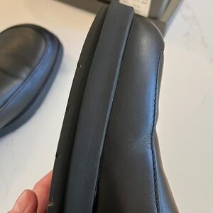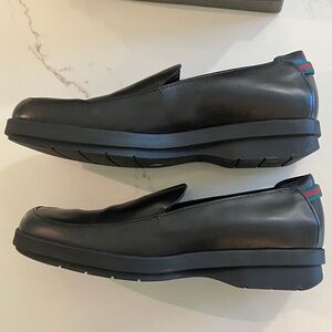 Like new Gucci loafers shoes. Black leather upper and bottom rubber sole. Size 9.5. Gucci green/red color ribbon on back of shoes. Purchased many years ago at Gucci, worn once and have been in the closet since. The very bottom of the rubber soles look dirty but I wiped down and they’re clean. I think it’s dried dust stain as they sat in the closet not in the box. Comes in original box/tissue paper and with Gucci dust bag. Box is tiny bit dented in one corner and I taped.
