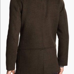 A military officer-inspired wool-blend coat in a lean, tailored fit is refined with raw-edge detailing and cool contrast fabric popping from the beneath the collar.