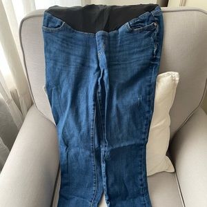 These are the BEST. The tummy panel is stretchy and supportive, but not itchy. No sliding down or having to tug your pants up! Gently worn and washed. Slight, intentional distressing on one leg. These say they’re an 8 regular, but I wore them as a petite and they weren’t so long as to be a problem for me.