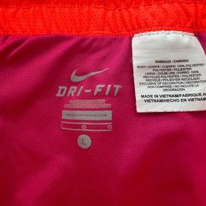 Like new. Nike Dri Fit women’s running short. Pink with fluorescent orange and white detail. Size large.