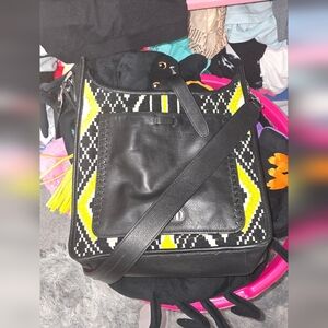 Design: Black and yellow patterned crossbody or shoulder bag with a bohemian or ethnic-inspired pattern.