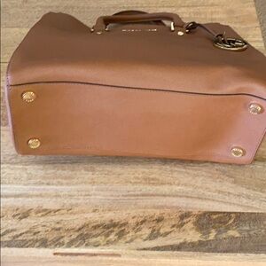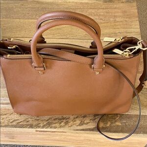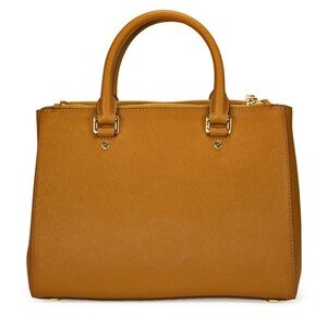 Sutton Medium Satchel made in brown saffiano leather with a fully lined interior. Rolled handles with removable, adjustable crossbody strap. Magnetic closure. Signature logo hardware and hanging medallion. Flat base with metal feet. Lined interior includes zipper compartments, slip pockets, and key holder. Bottom Width: 12 inches. Depth: 5 inches. Height: 9 inches. Strap Length: 40 inches. Strap Drop: 18 inches. Handle Length: 15 inches. Handle Drop: 5 inches. Dust bag is included.
