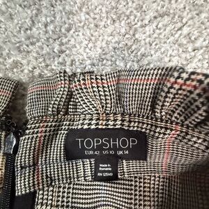 Add timeless sophistication to your wardrobe with this Topshop plaid mini skirt in excellent pre-owned condition. Designed with a classic black and white checkered pattern with subtle red accents, this skirt features a flattering high-waisted fit with stylish button detail and a lightly ruffled waistline.
