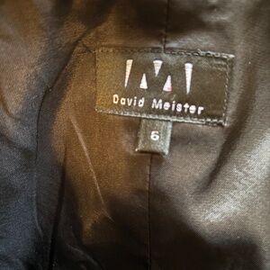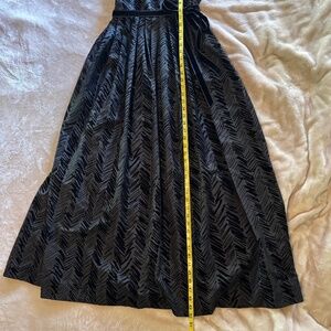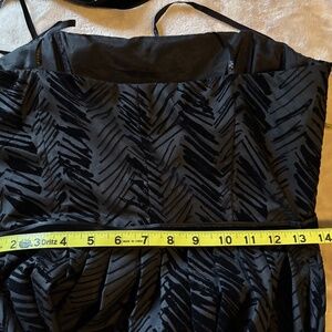 Like new. Women's David Meister size 6 formal black on black strapless dress, with black velvet accent detail pattern and black velvet ribbon tie. The pleats at waist create a beautiful fullness effect of the skirt. The pictures that look like spaghetti straps are actually the hanger straps (the dress is strapless). Ribbing in bust for structure. Fully lined. Side zipper closure and 2nd zipper for lining in bust (last pic lining pulled out of the dress to show the additional zip up feature). Approximate measurements: 50" length, 14" waist, 15.5" pit to pit.
