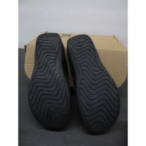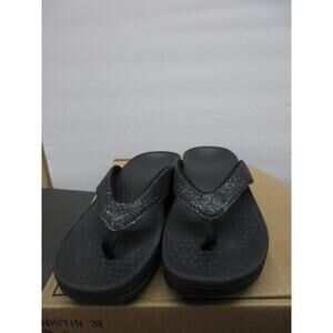 These stylish sandals feature a sleek black design, offering both comfort and versatility for various occasions. The cushioned footbed and adjustable straps ensure a snug fit for all-day wear. The sandals show minimal signs of wear and are in excellent condition, ready for continued use.
