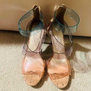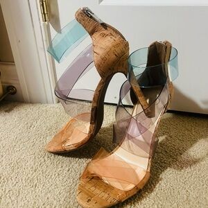 Elevate your style with these chic transparent strap heels with cork soles and heel. Size 6.5 and like new! Featuring a unique blend of tan and blue hues, these shoes are perfect for any occasion. Step out in confidence and comfort.