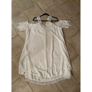 Cute babydoll coold ahoulder dress. Lace peeking out of the underdress. Lace details. Armpit to armpit is 24 inches and length is 42 inches.