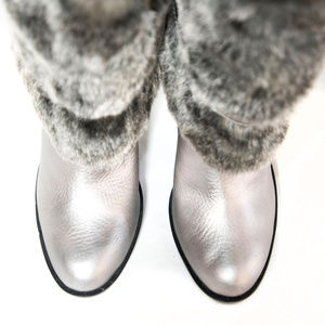 Like new Michael Kors 'Carlie' faux fur boots in gunmetal metallic gray with faux fur and silver hardware atop a block heel. EUC with no major flaws. Comes in original box.