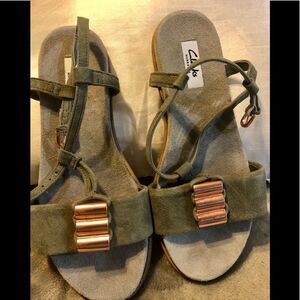 Great comfortable sandals in suede in sage by Clarks . These are like new never worn. Adjustable streps.