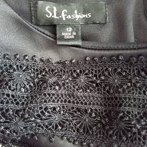 Gorgeous bands of lace and satin fabric. Scoop neck in front and back. Short sleeves and full back zipper. LIke new.