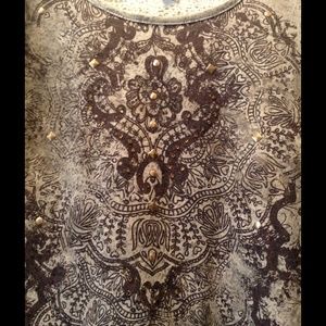 Light grey burn out shirt with 3/4 length sleeves, ties to ruche both sides and a decorative front with gold beading and dark purple print by Style & Co, Petite size!