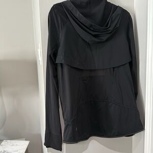 Lululemon nylon hoodie in black size 10. Only worn once. It’s a dual layer with vent on top and zippered pockets. Zip up. Collar plus hood. Excellent condition. Smoke-free home.