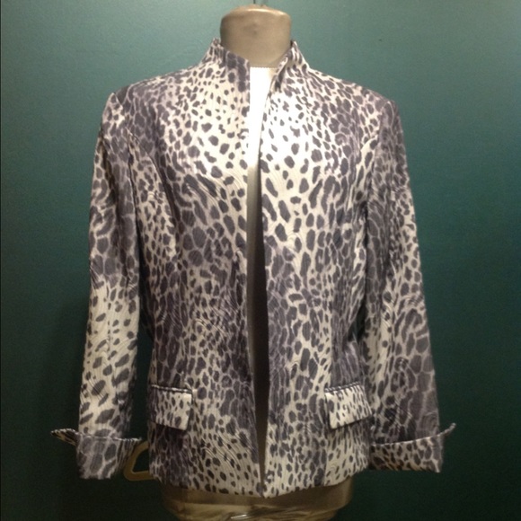 Never worn short grey and shimmering white cotton poly jacket. Sleek animal print. No button stand up collar. Or open neck. Two pockets.havent been opened yet. Fully lined. Beautiful quilted,like fabric. 25! In from shoulder. 20 in pit to,pit